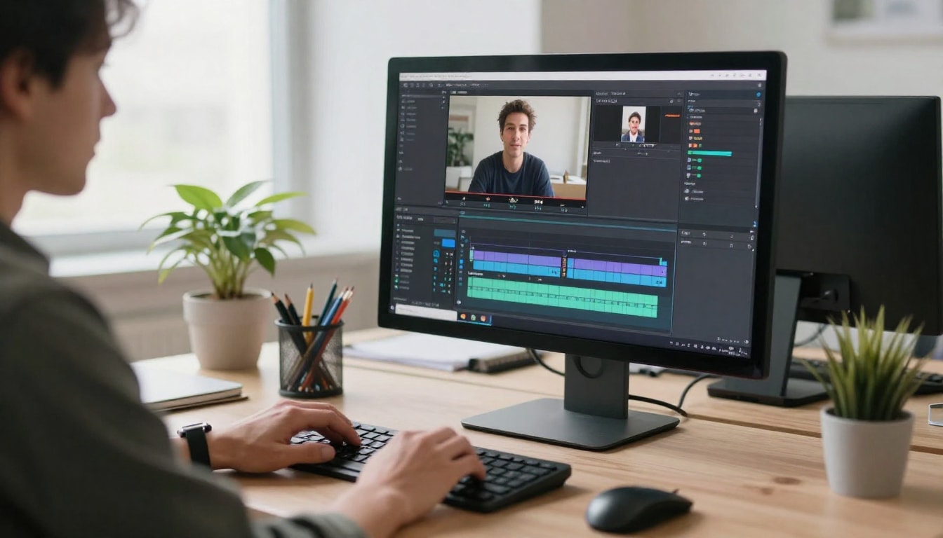 Person using computer for video editing, creative workspace, modern office setup, content creator at work, natural lighting, professional photo style
